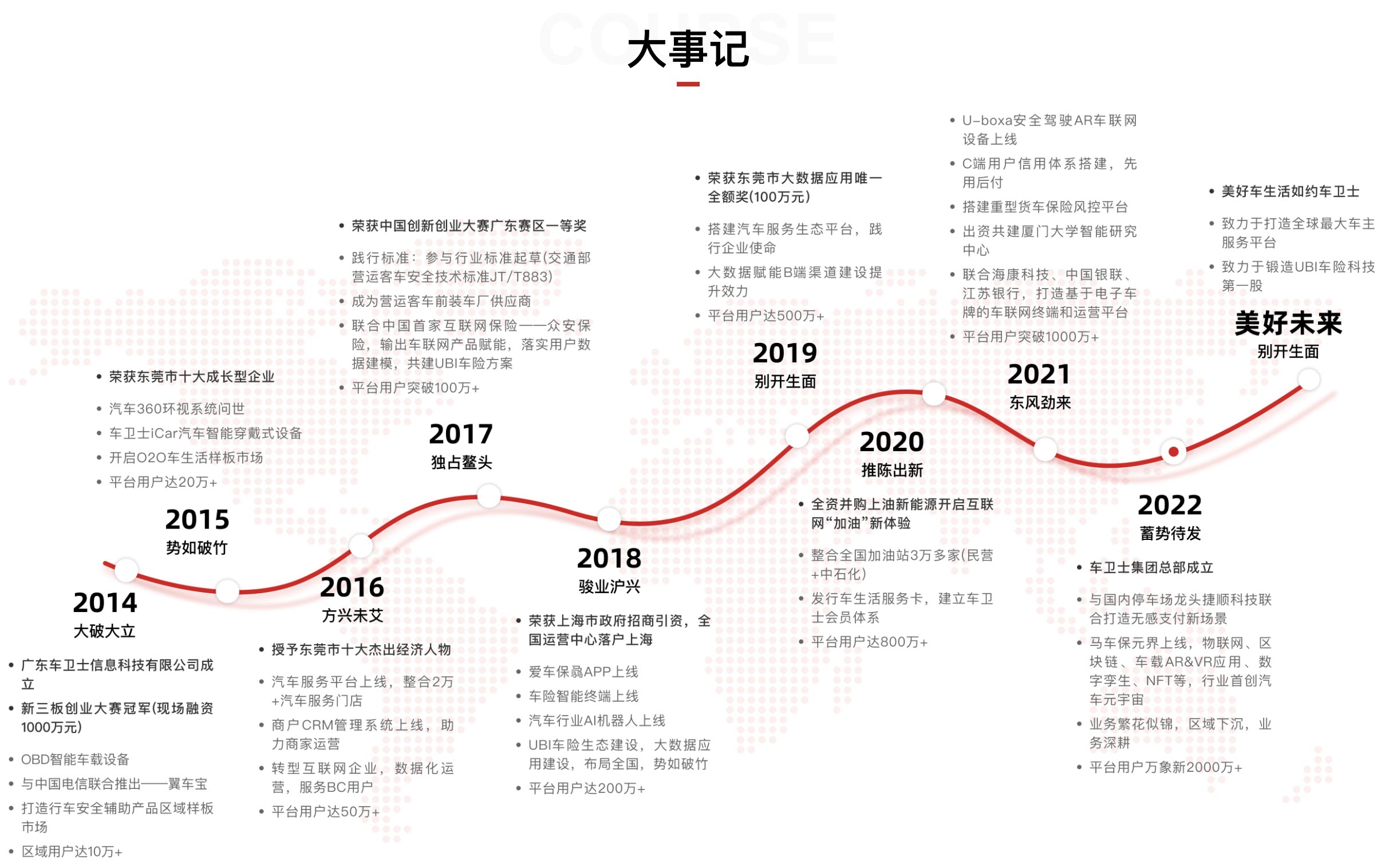 我们致力于AI智能车联网硬件及车联网数据应用,通过大数据算法及应用能力与多家保险公司联合运营,拥有多项独立自主的技术和专利。智能科技赋能汽车服务的生态,创新与极致打造我们追求的使命:“让汽车生活更美好”。